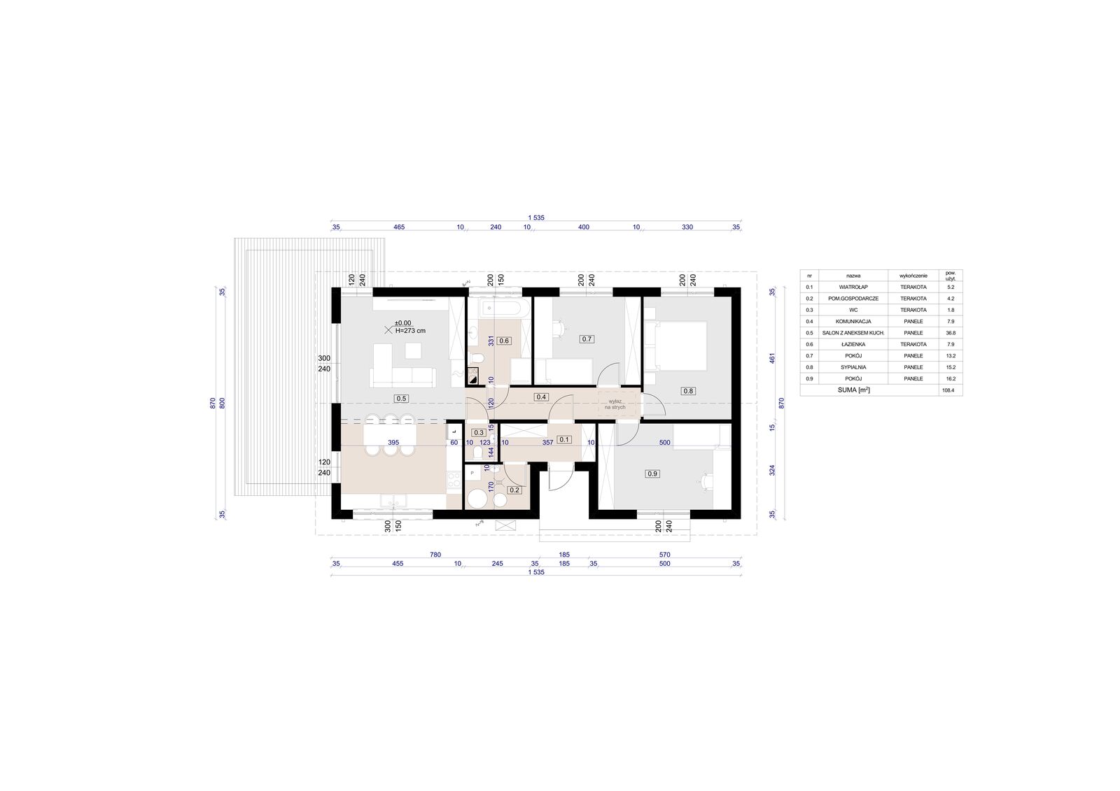 Moderna 108 to przytulny dom parterowy z 3 sypialniami oraz aneksem kuchennym połączonym z salonem. Zaprojektowany z myślą o wielbicielach klasycznej formy i ekonomicznych rozwiązań zaakcentowanych subtelnym wykończeniem. Prosta bryła domu doskonale odnajdzie się na każdej działce, a czytelny i komfortowy układ funkcjonalny docenią nawet najbardziej wymagający inwestorzy. Budowa zgodna z zastosowaną w dokumentacji technicznej izolacją termiczną i materiałami konstrukcyjnymi gwarantuje:- założoną izolacyjność cieplną i akustyczną przegród budowlanych- odpowiednią wytrzymałość i odporność ścian na działanie czynników atmosferycznych- właściwy bilans energetyczny oraz wymagane przepisami parametry sprawności energetycznej budynku- komfort termiczny: izolacja od zimna, gorąca i hałasu- komfort użytkowania, jakość i bezpieczeństwo- zdrowy mikroklimat wnętrz, czyli zdrowy dom