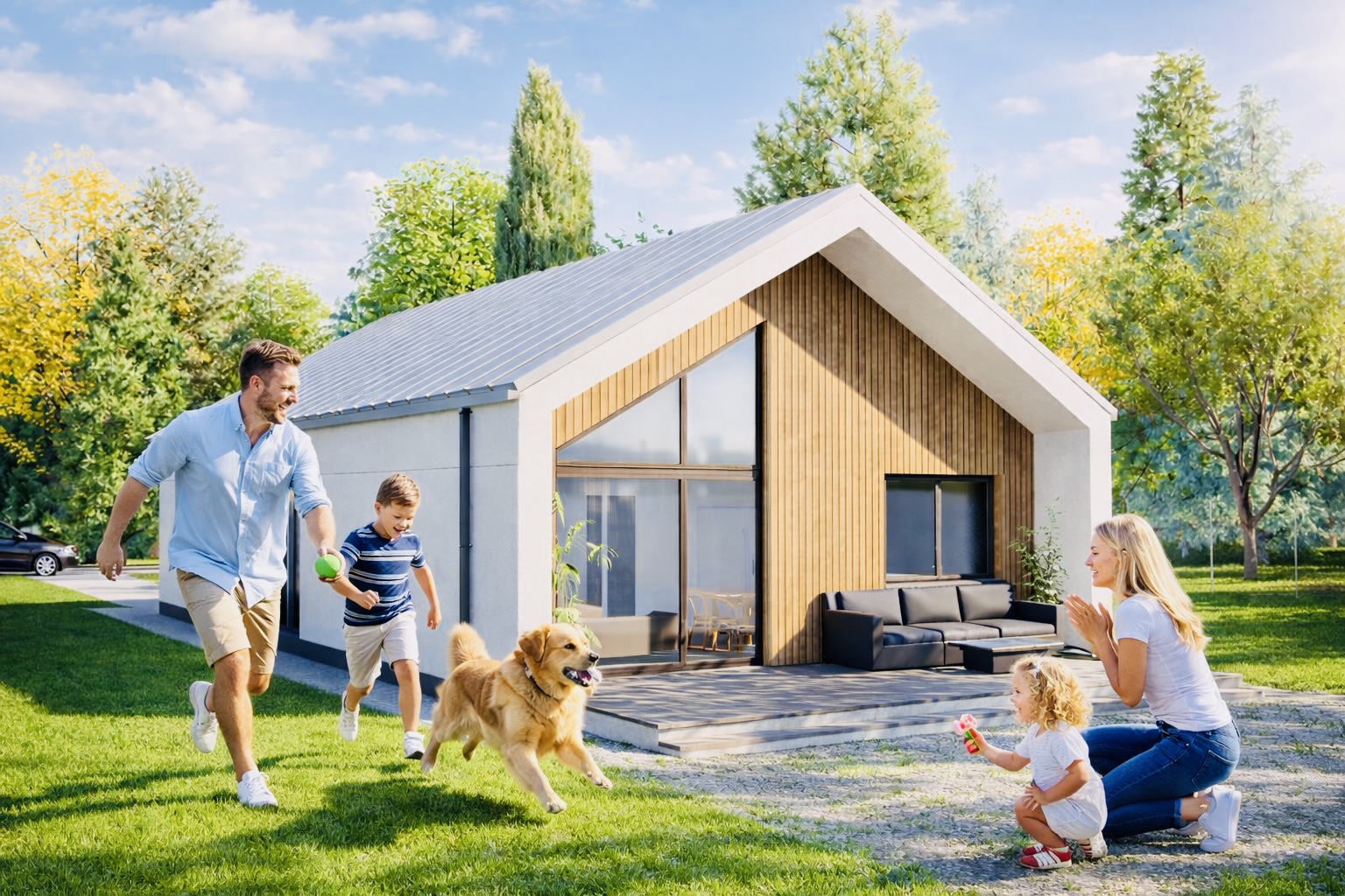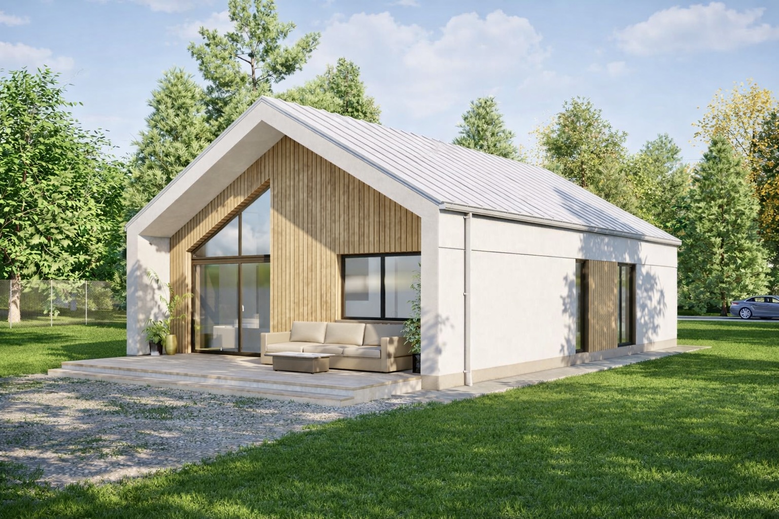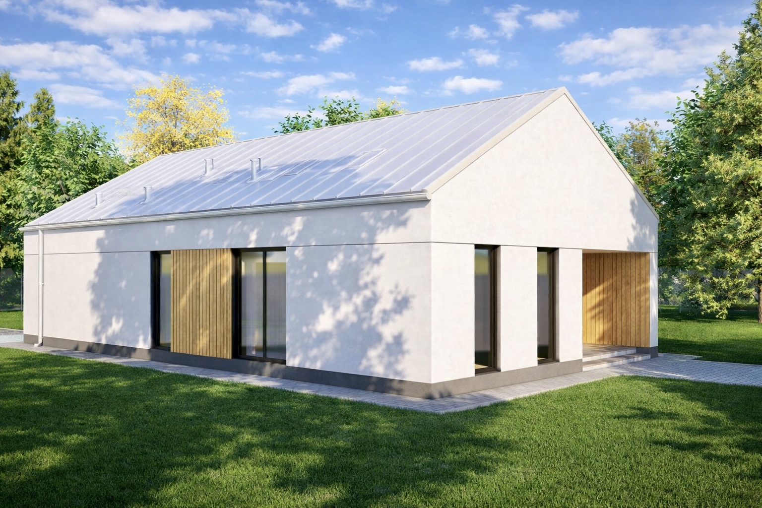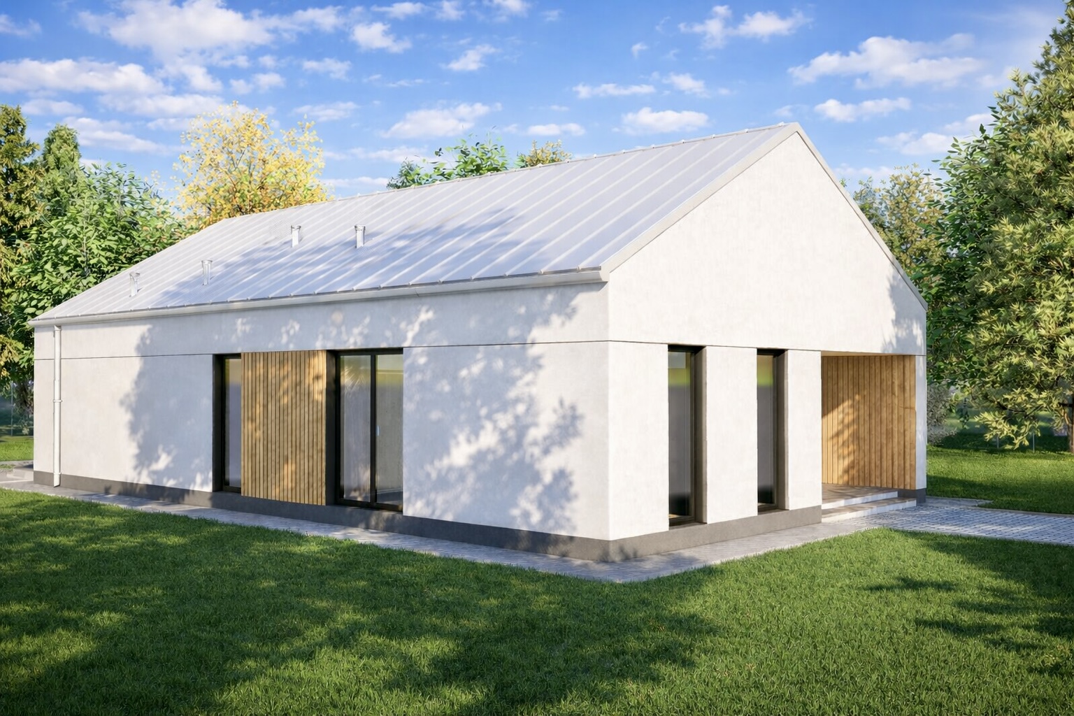 🏡 Moderna 105 to nowoczesny dom parterowy zaprojektowany z myślą o wąskich działkach. Prosta bryła z dwuspadowym dachem zapewnia ponadczasowy wygląd i niższe koszty budowy. Na około 105 m² znajduje się funkcjonalny układ z jasnym salonem, kuchnią oraz trzema sypialniami, idealny dla rodziny. Jasna elewacja z możliwością zastosowania drewnianych akcentów podkreśla nowoczesny charakter budynku. MODERNA 105 to komfort, wygoda parteru i możliwość szybkiej realizacji w technologii prefabrykatów keramzytowych.