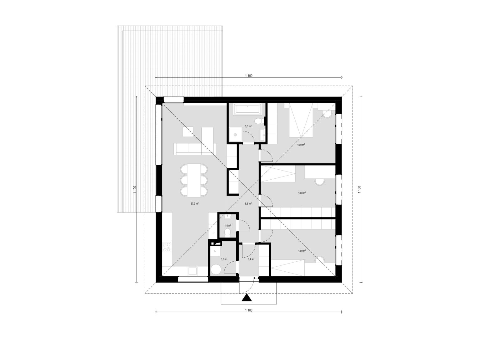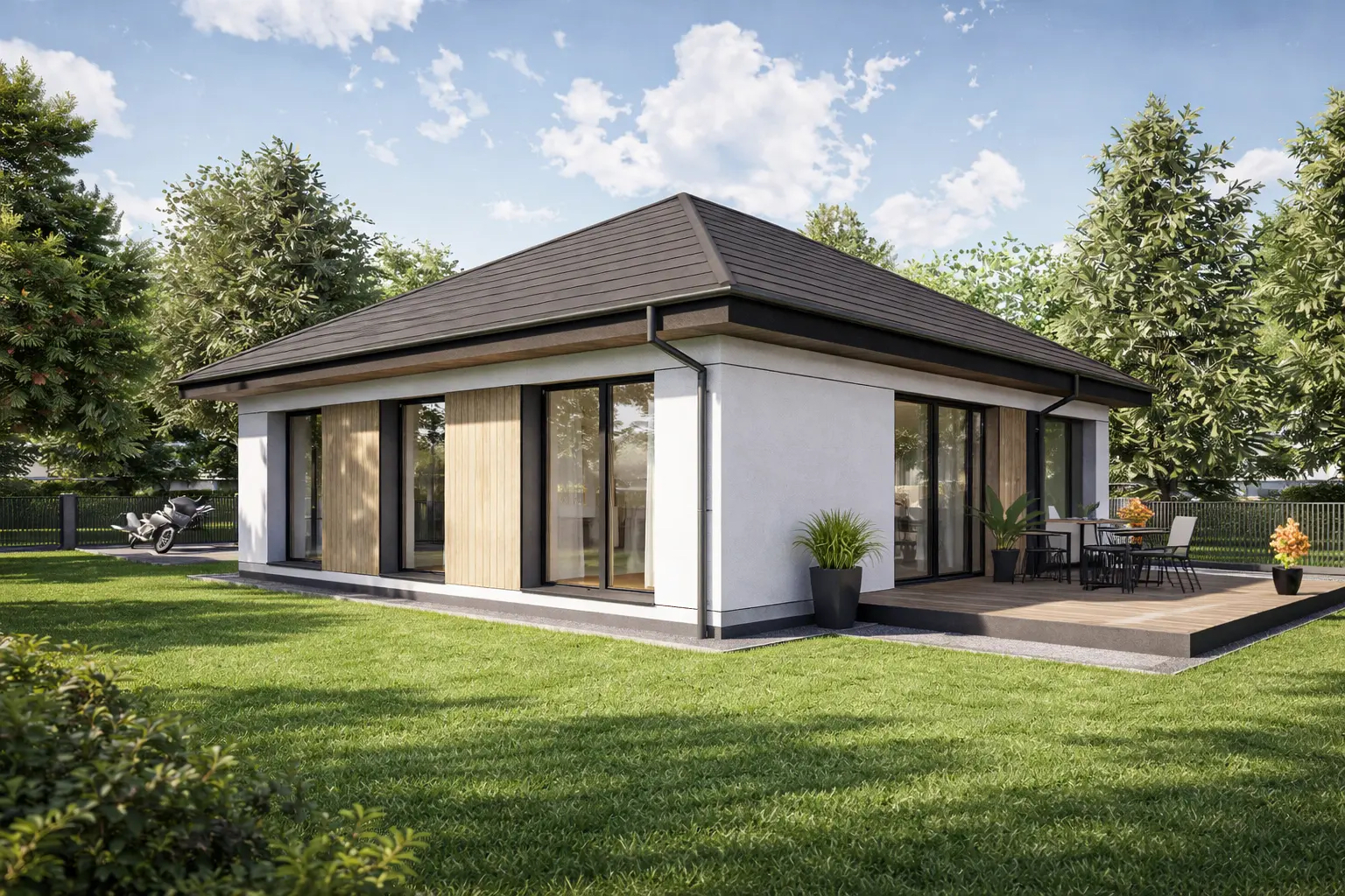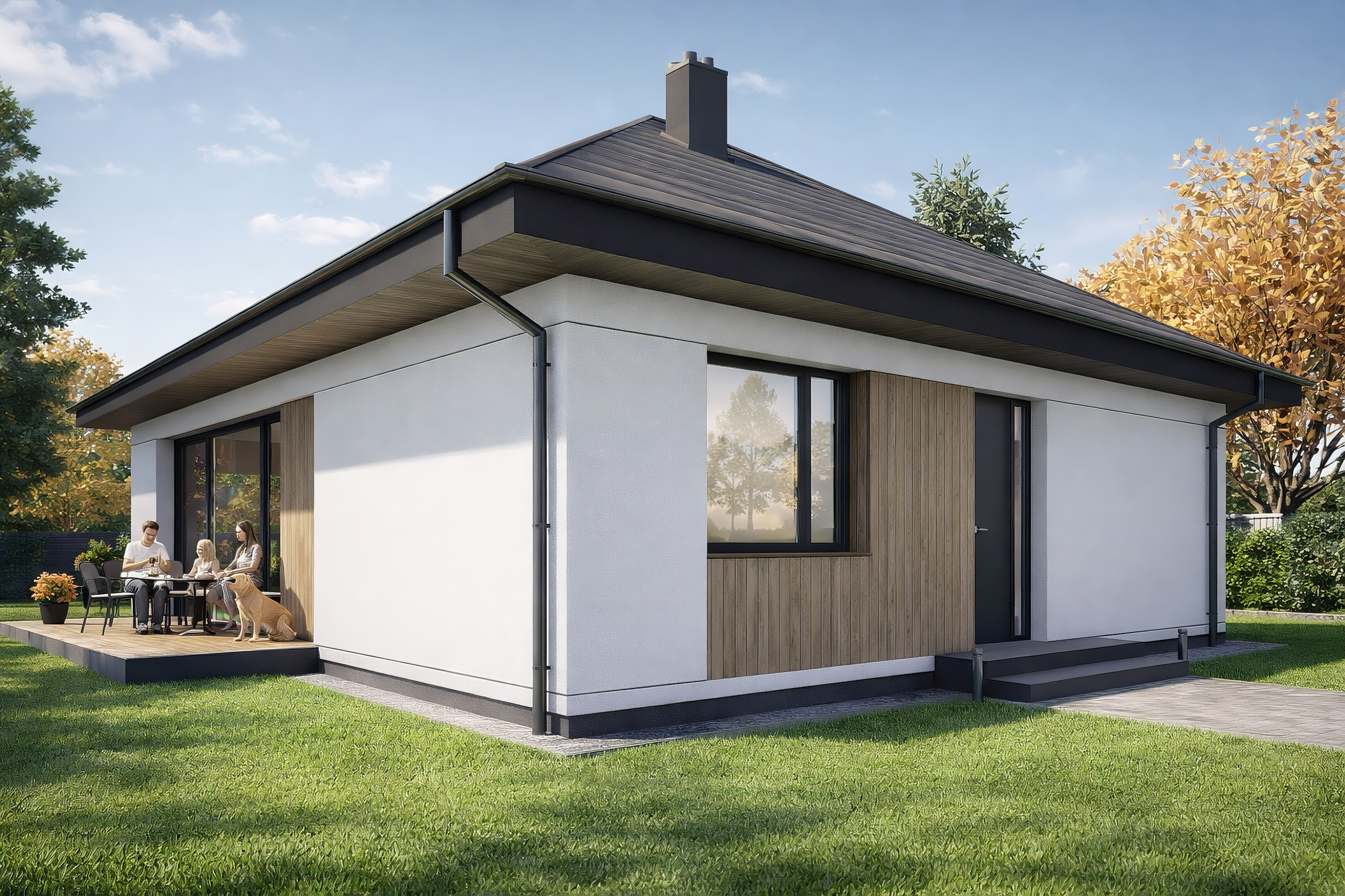 Moderna 101 to nowoczesny dom parterowy z dachem czterospadowym, zaprojektowany w kompaktowej, ekonomicznej bryle 🏡✨ Idealny metraż zapewnia pełną funkcjonalność bez zbędnych metrów. Przestronny salon z aneksem kuchennym stanowi serce domu 🛋️🍽️, a 3 pokoje i 2 łazienki gwarantują komfort codziennego życia 🚿🛏️ To ponadczasowy projekt dla osób szukających wygodnego, nowoczesnego domu na lata 🔑💚