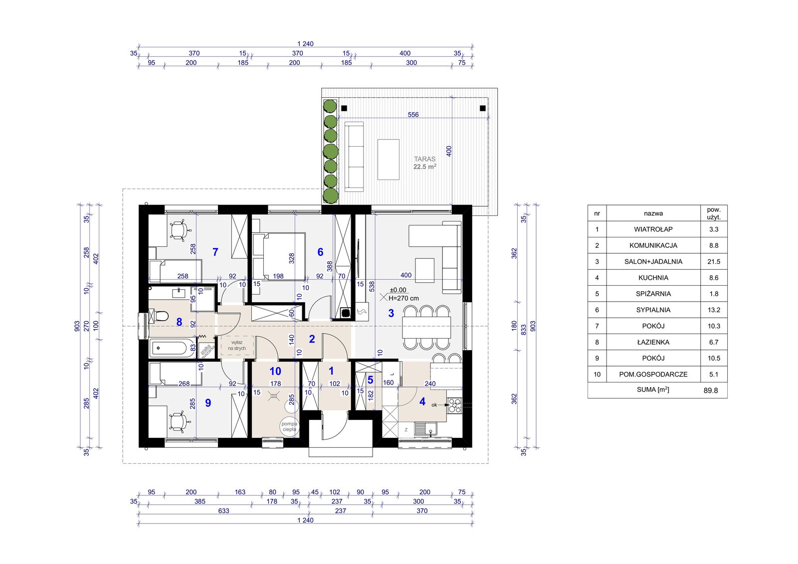 Moderna 91 – dom, który dopasuje się do Ciebie. Moderna 91 to parterowy dom o powierzchni 91 m², zaprojektowany tak, aby łączyć nowoczesny design, funkcjonalność i komfort codziennego życia . W środku znajdziesz 4 pokoje , przestronny salon z aneksem kuchennym 2 łazienki oraz praktyczną< – czyli wszystko, czego potrzebuje współczesna rodzina 2+2. Projekt dostępny jest w 3 wariantach dachu : elegancki kopertowy, minimalistyczny bezokapowy w formie nowoczesnej stodoły oraz klasyczny dwuspadowy. Do tego możesz wybrać dekor elewacji w jednej z 3 odsłon lamele, dekor drewnopodobny lub beton – by nadać swojemu domowi wyjątkowy charakter. Niewątpliwym atutem jest 18-metrowy zadaszony taras , który tworzy idealną przestrzeń do spotkań z bliskimi, relaksu z kawą o poranku czy rodzinnych kolacji na świeżym powietrzu. A jeśli potrzebujesz więcej miejsca, projekt daje możliwość adaptacji poddasza , by Twój dom rósł razem z Tobą i Twoimi planami. Moderna 91 to dom, który łączy nowoczesną architekturę z praktycznymi rozwiązaniami – gotowy, aby stać się sercem rodzinnego życia.
